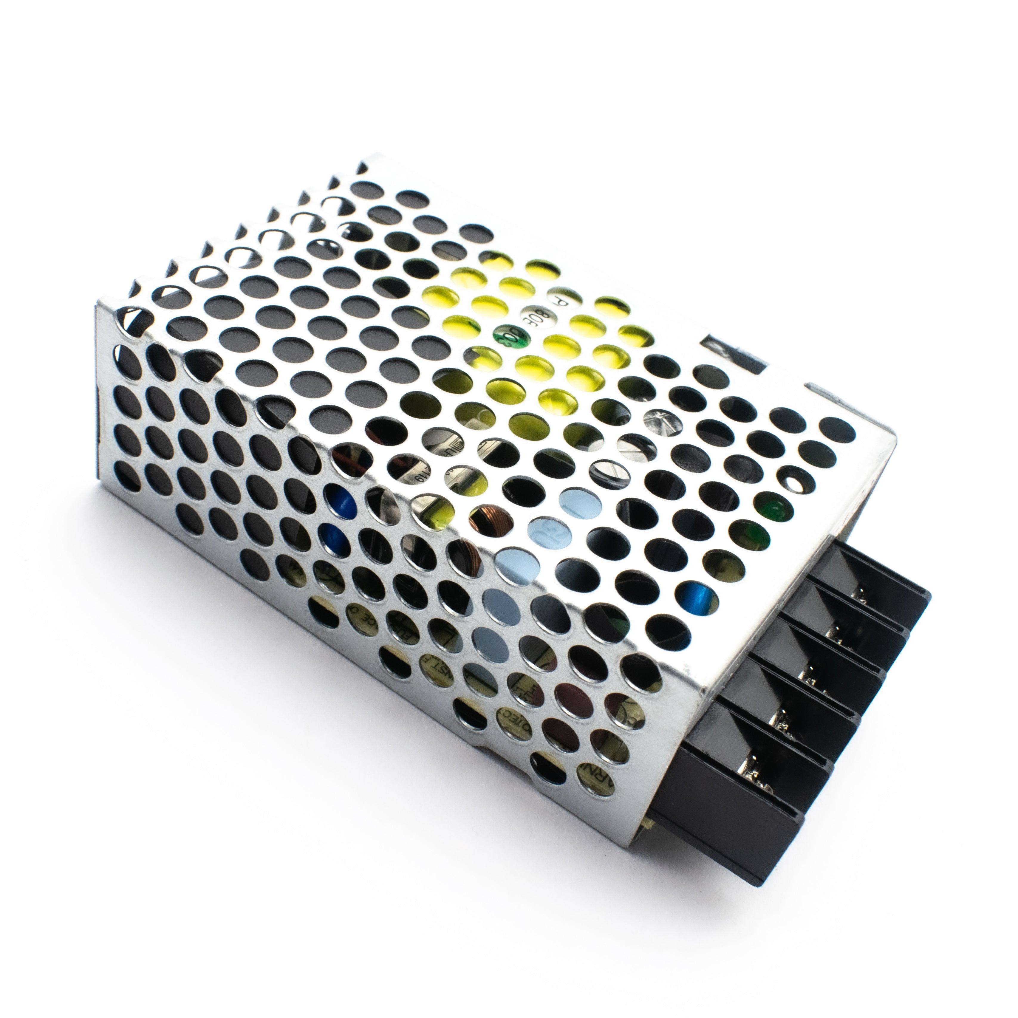 Meanwell's RS-25 series is a 25W single-output enclosed type power supply with 30mm of low profile design. The AC input is 85-264VAC which could be directly supplied from the house supplied voltage. The output from SMPS will be 5V. The SMPS has high efficiency up to 78.5%, the design is of metallic mesh case which enhances the heat dissipation of RS-25 that the whole series operates from -20°C through 70°C under air convection without a fan. It has extremely low no-load power consumption (less than 0.5W), which allows the end system to easily meet the worldwide energy requirement.