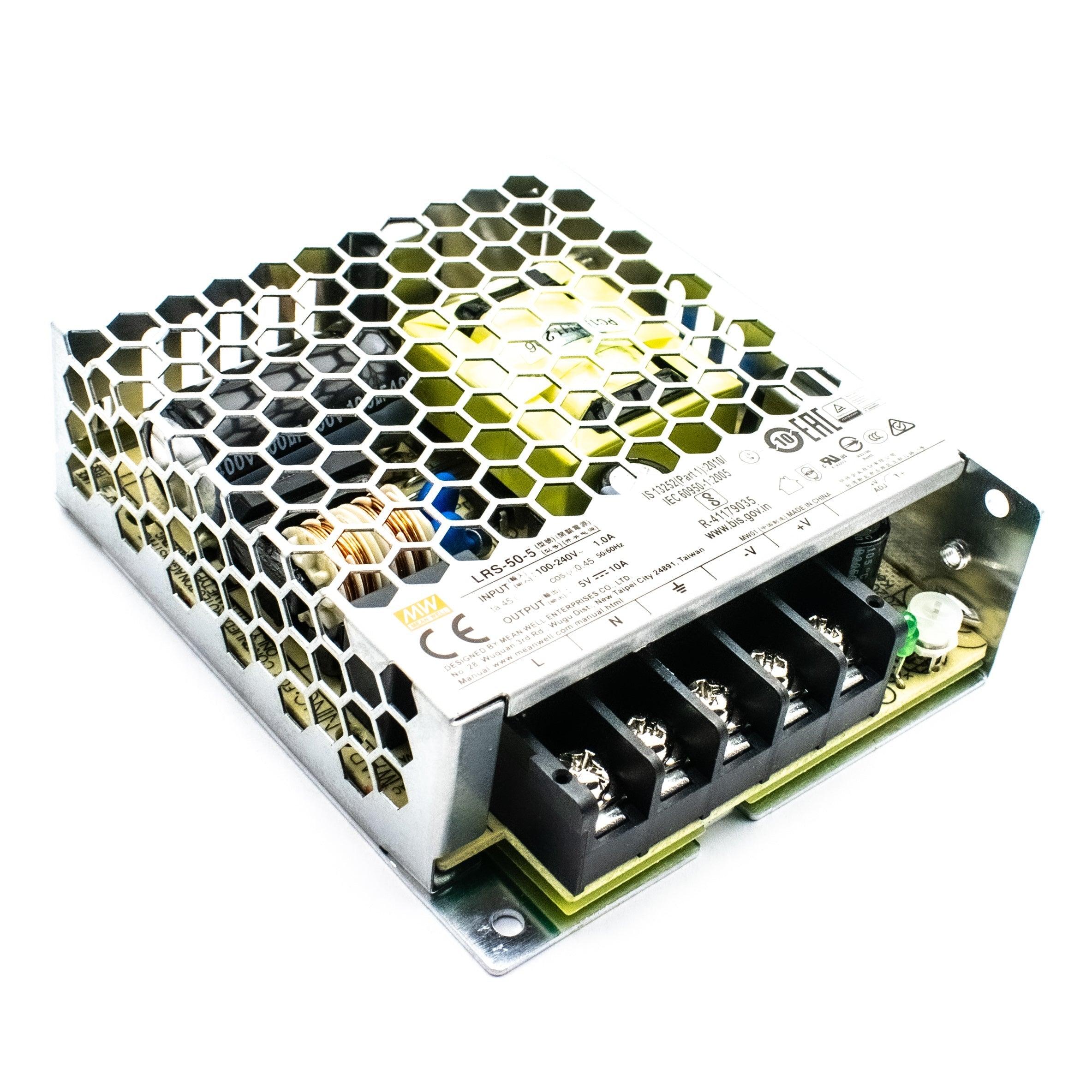 Meanwell's LRS-50 series is a 50W single-output enclosed type power supply with 30mm of low profile design. The AC input is 85-264VAC which could be directly supplied from the house supplied voltage. The output from SMPS will be 5V. The SMPS has high efficiency of up to 83%, the design is of a metallic mesh case that enhances the heat dissipation of LRS-50 that the whole series operates from -30°C through 70°C under air convection without a fan. It has extremely low no-load power consumption (less than 0.2W), which allows the end system to easily meet the worldwide energy requirement. Meanwell's LRS-50 SMPS has complete protection functions and 5G anti-vibration capability; it complies with international safety regulations such as TUV EN60950-1, EN60335-1, EN61558-1/-2-16, UL60950-1 and GB4943. LRS-50 series can be used for many purposes with the best performance from it.